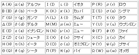 ギリシャ文字〜英文字の対応表