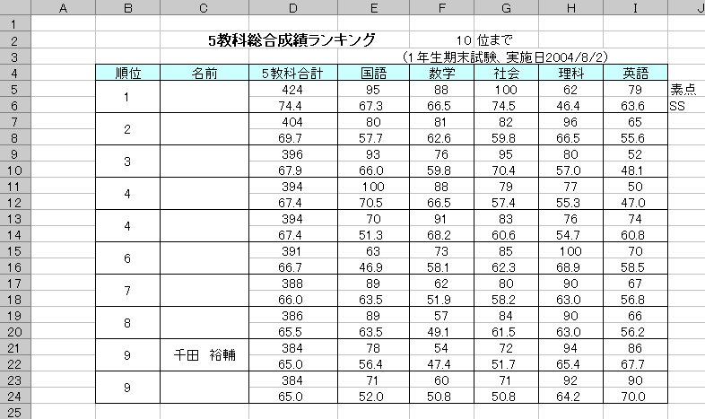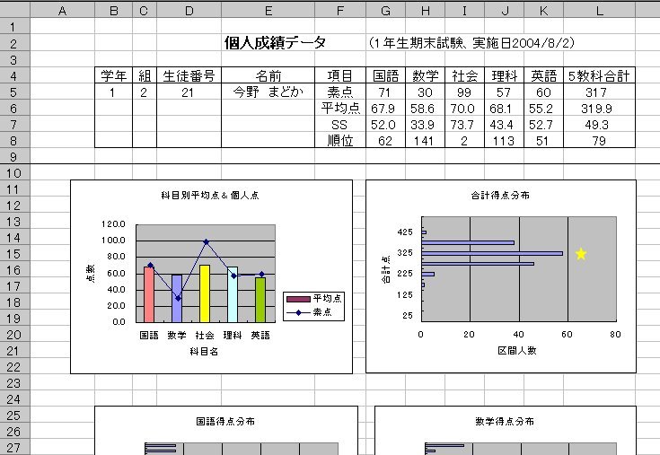 期末試験や学力試験などの成績を基に、個人成績データ、5教科総合成績ランキング表