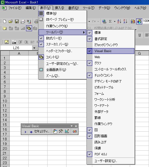 「表示」メニューの「ツールバー」を選択し、サブメニューにて「Visual