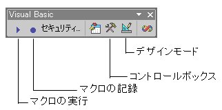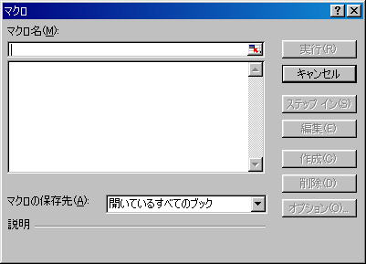 このボタンをクリックすると、「マクロ」ダイアログボックスが現れ、マクロの実行、編集、