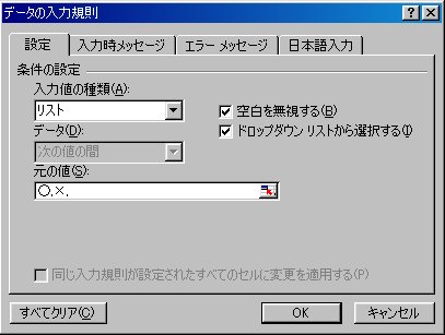 入力値の種類を「リスト」にして元の値欄に○と×と空白を半角のカンマで