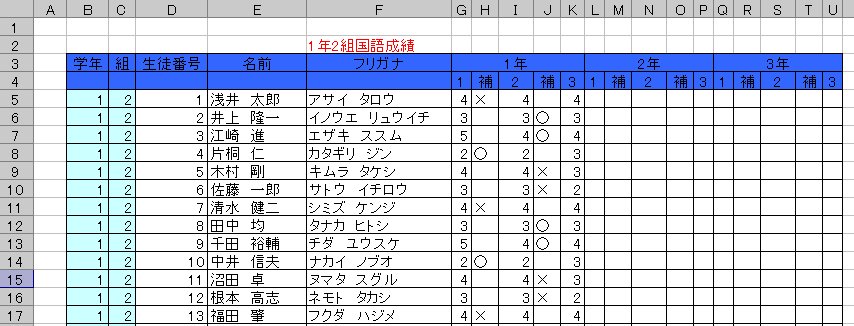 3)成績を記入します。なお、補助評価の欄は、リスト入力で簡単に○、×、空白を入力