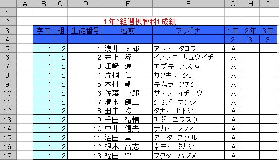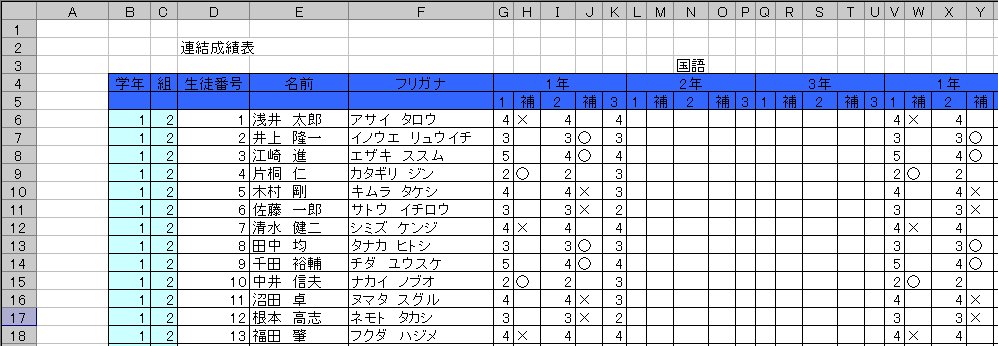 成績の貼り付けは科目により列番号がずれること、連結表に科目名を記載することなど