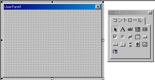 ユーザーフォームを選択すると、次のようなウィンドウ画面とツールボックスが表示されます。