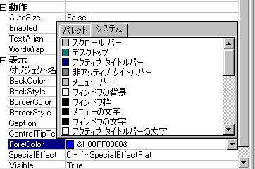 からプロパティウィンドウを開きます。次に、「項目別」タブに切り替え、表示/ForeColorを
