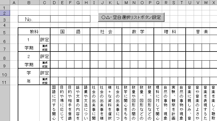 74、75行目 :成績未記入シート「5段階評価」には「○,△,・,空白選択リストボタン設定」の
